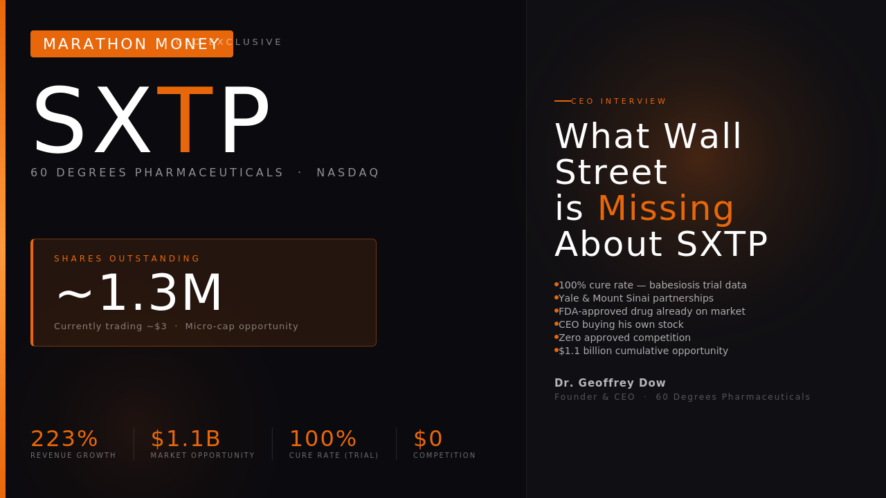 60 Degrees Pharmaceuticals (NASDAQ: SXTP) might be one of the most overlooked micro-cap opportunities in the biotech space right now. We sat down with CEO Dr. Geoffrey Dow to uncover what most retail investors are completely missing an FDA-approved drug already generating revenue, a 100% cure rate in their babesiosis trial, and zero approved competition in a market worth over a billion dollars. With only about 1.3 million shares outstanding after their recent reverse split, this stock doesn’t need much fuel to move fast.
